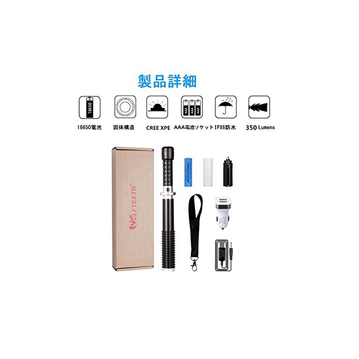 원본상품명: 中電 超明るい LEDライト 警棒 護身 防犯 5W ズム機能付き 充電可能 350Lm フラッシュライト セット容:18650プラスチック電池ケス AAA電池ソケット 充電ケブル 明書