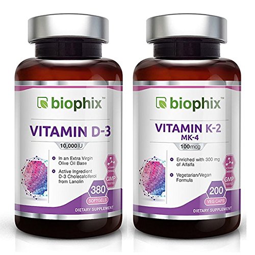 -. Binding : Health and Beauty -. Brand : biophix -. EAN : 0849440003185 -. Feature : Manufactured to the Highest Quality Available / Satisfaction Ensured / Great Gift Idea -. Label : Biophix -. LegalDisclaimer : This information is intended for your general knowledge only and is not substitute for professional medical advice or treatment for specific medical conditions. This information is not intended to diagnose, treat, cure or prevent any disease. Always seek the advice of your qualified physician or other health care provider with any questions you may have regarding a medical condition. Keep out of reach of children. -. Manufacturer : Biophix -. MPN : 0849440003185 -. NumberOfItems : 1 -. PackageQuantity : 1 -. PartNumber : 0849440003185 -. ProductGroup : Health and Beauty -. ProductTypeName : HEALTH_PERSONAL_CARE -. Publisher : Biophix -. Studio : Biophix -. Title : D-3 10,000 IU 380 Softgels - Vitamin K-2 100 mcg 200 Caps Pack - Olive Oil Strong Bones Immune Health Support for K-2 -. UPC : 849440003185