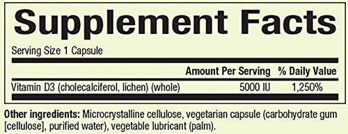 Whole Earth Sea Vegan Bioenhanced Vitamin D3 5000 I.U. by Natural Factors 60 Softgel Whole Earth Sea Vegan Bioenhanced Vitamin D3 5000 I.U. 60 Softgel product'solely plant based Vegan Bioenhanced Vitamin D3 is carefully extracted from lichen to provide a readily absorbable form of this nutrient important for healthy bone development and immune support. This supplement is ideal for vegans and strict vegetarians but can help everyone get their daily max of the sunshine vitamin. Gluten Free Suggested Use As a dietary supplement take 1 capsule per day - Or as directed by your healthcare professional. Supplement Facts Serving Size 1 Capsule Servings Per Container 60 Amount Per Serving Daily Value Vitamin D3 (cholecalciferol lichen) (whole) 5000 IU 250 Percent Daily Values are based on a 2 000 calorie diet Other Ingredients Microcrystalline cellulose vegetariam capsule (carbohydrate gum)(cellulose) purified water) vegetable lubricant (palm) Warnings Keep out of reach of children. As with al