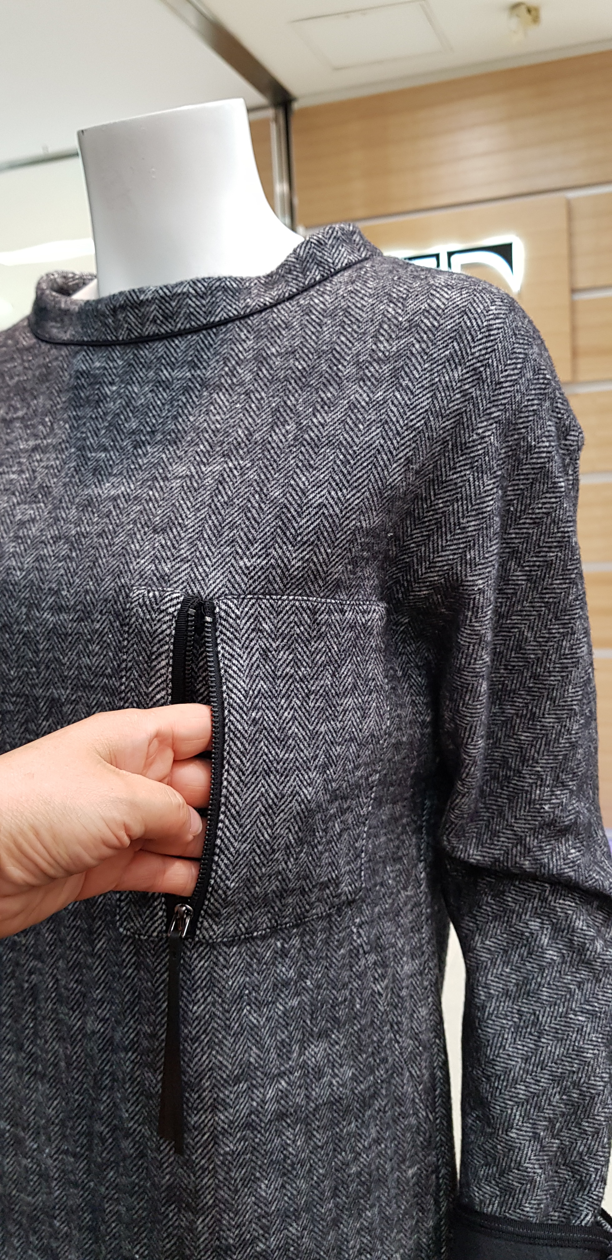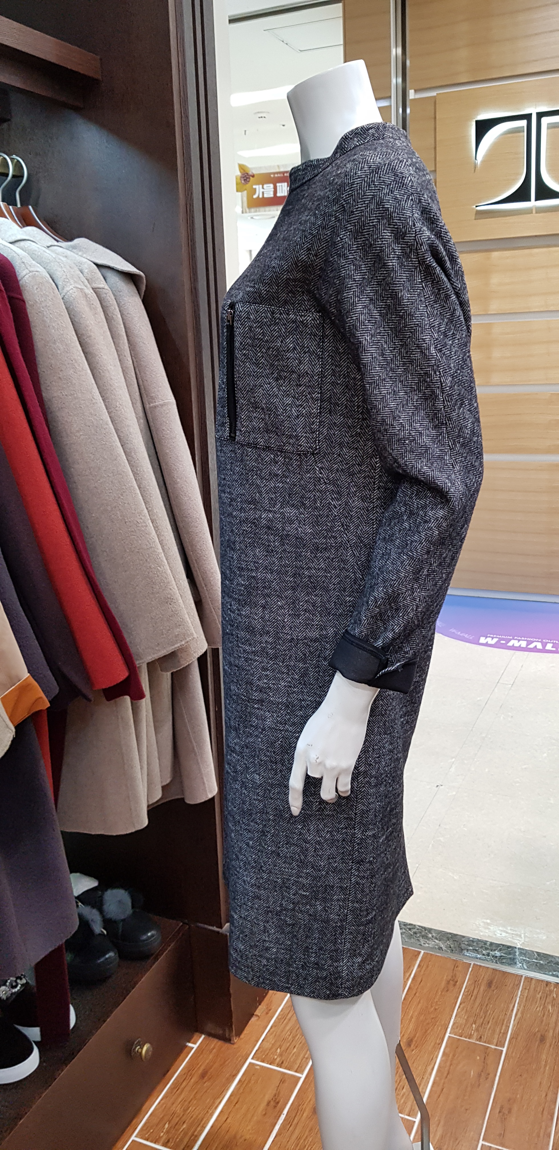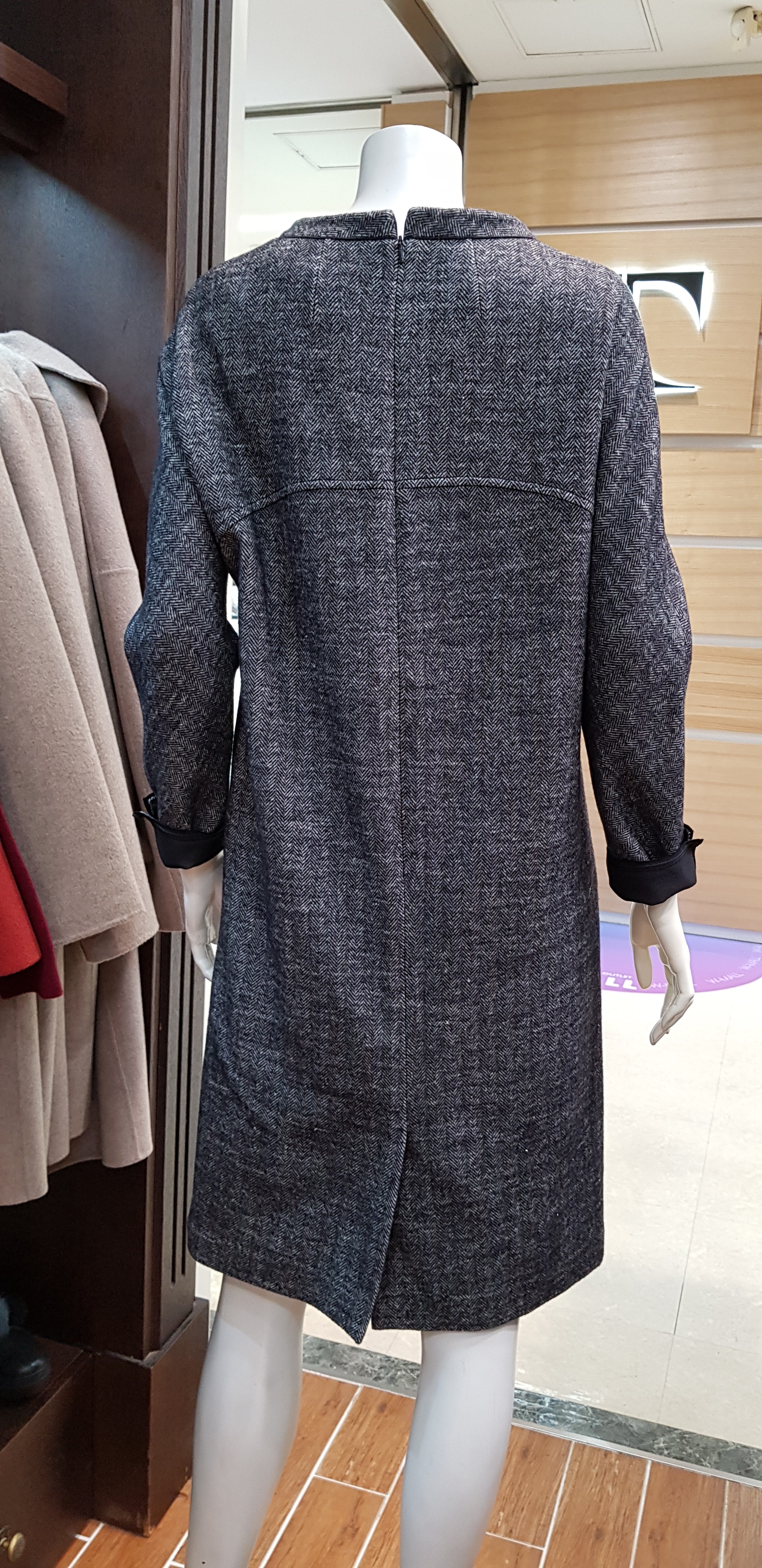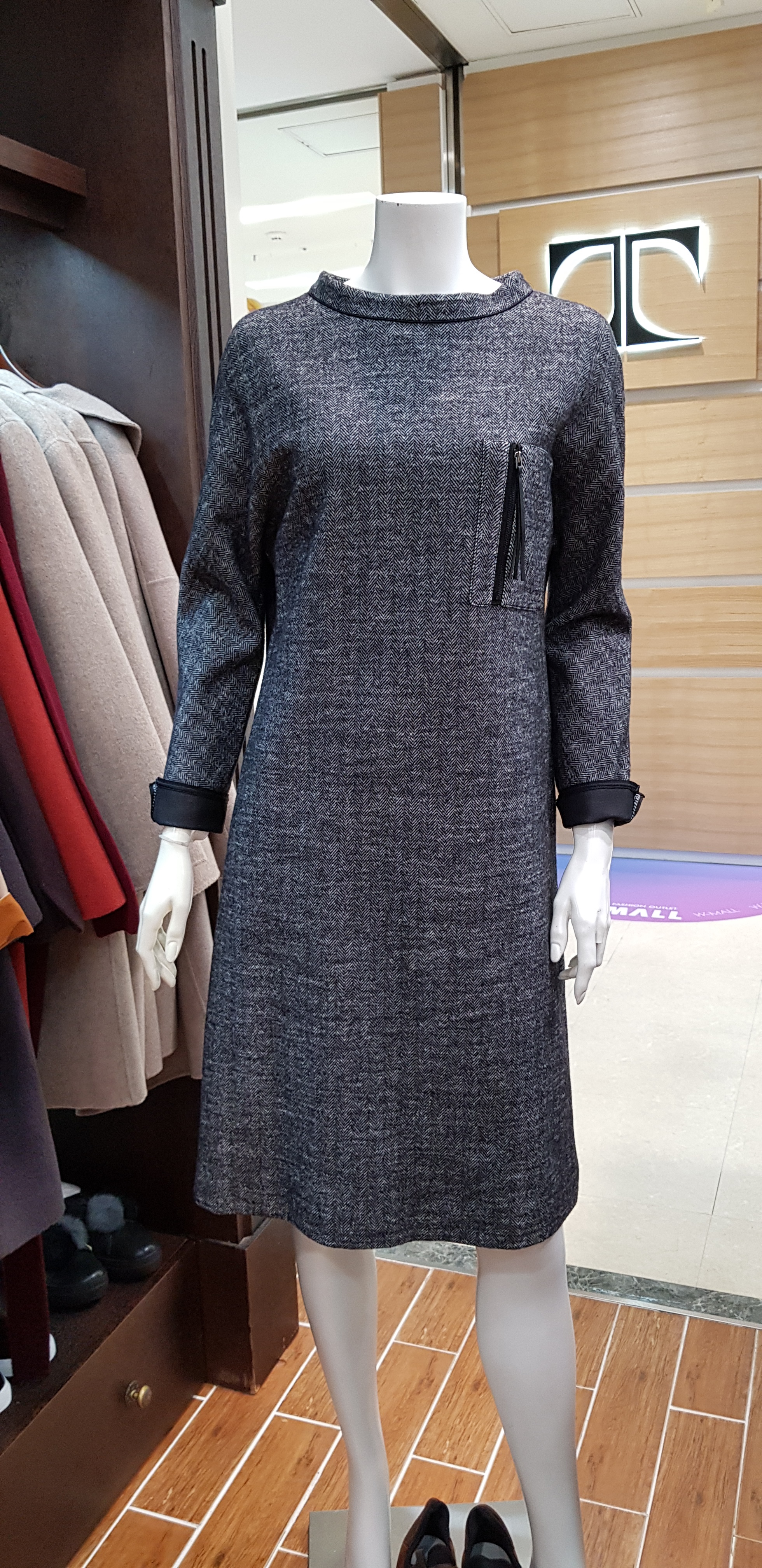 키이스~드롭어깨의 박시한핏의 원피스입니다 보트넥이라 여성스럽고  헤링본의 정중함이 고급스러운 캐주얼한 분위기연출에도 좋은 아이템입니다 총장94센티입니다