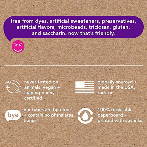 Free from dyes, artificial sweeteners/flavors, preservatives, microbeads, triclosan and gluten.