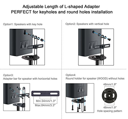 Multiple speaker attachment options4 attachment options are available for different speakers. Adjustable height attachment design for vertical hole and key hole, adapter bar for horizontal holes, and round holder for wooden speaker without hole