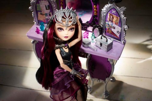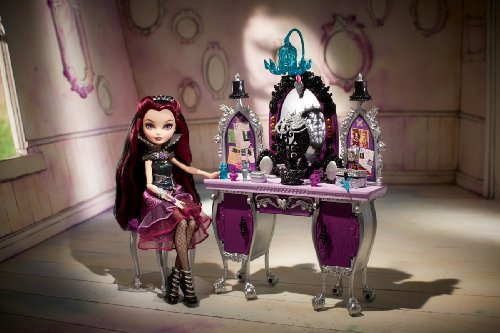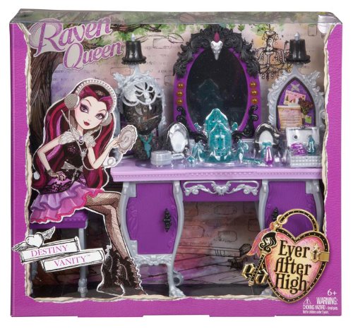 -. Binding : Toy -. Brand : Ever After High -. EAN : 0797839757709 -. Feature : Raven Queen (doll sold separately) is ready to ponder her fashion fate at this spellbinding vanity / Designed in Raven's signature purple, silver and black, it positively mesmerizes with wicked cool details / Features bird cage chandelier, queenly curved legs, sound speakers that look like mirrors and elaborate accents / A model head is perfect for displaying a hexcellent new silvery crown / Spin the bulletin boards to reveal rebel secrets or open the center shelf to discover a keyboard -. IsAdultProduct : 0 -. Label : Mattel -. Manufacturer : Mattel -. Model : BDB17 -. MPN : FBA_BDB17 -. PackageQuantity : 1 -. PartNumber : FBA_BDB17 -. ProductGroup : Toy -. ProductTypeName : TOYS_AND_GAMES -. Publisher : Mattel -. ReleaseDate : 2013-10-27 -. Studio : Mattel -. Title : Ever After High Getting Fairest Raven Queen Destiny Vanity Accessory -. UPC : 885403125655 -. Warranty : 1 year warranty against manufacturer defects