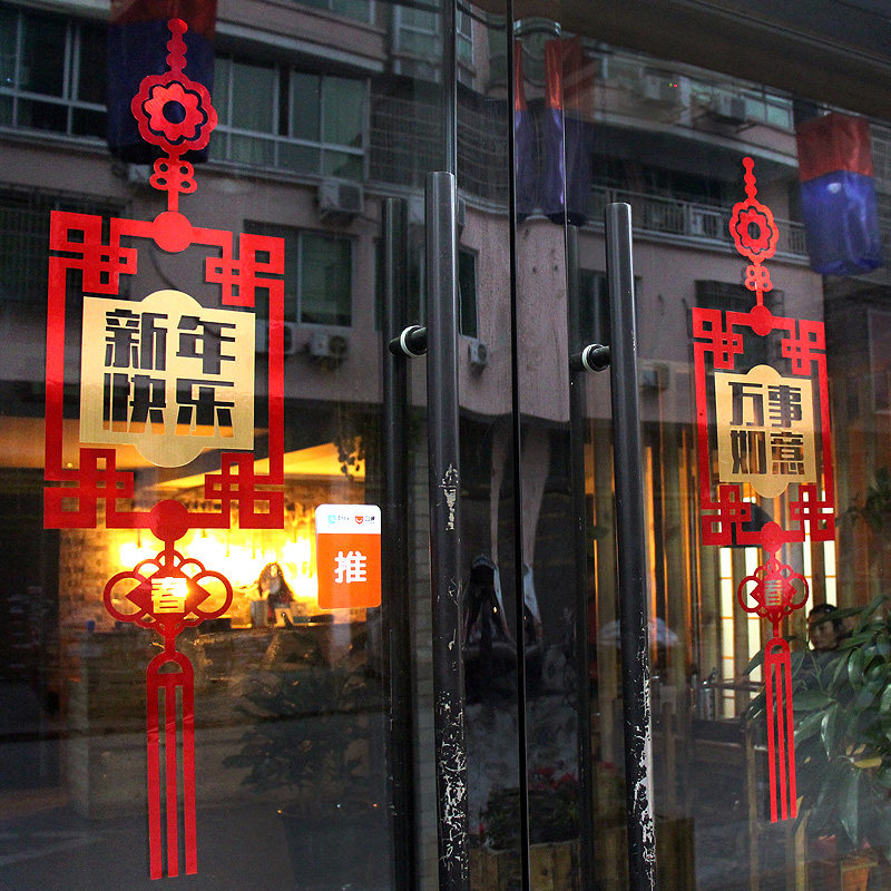 元旦新年装饰品商场店铺橱窗玻璃门贴纸窗花金色中国结春节墙贴画