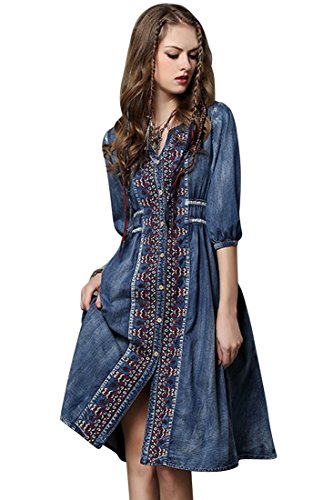 -. Title : (アザブロ)AZBRO レディース ヴィンテージ ジオ 刺繍 ボタンダウン 七分袖 ハイウエスト デニム ワンピース