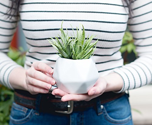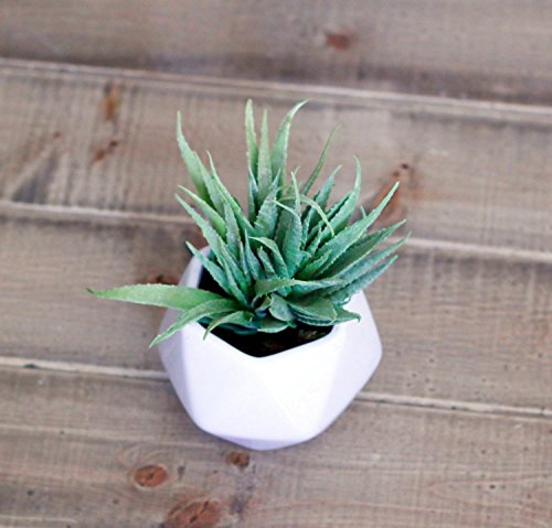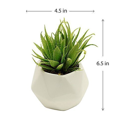 This mid century modern inspired faux succulent is perfect as an outdoor accent, or indoor in a home, office, or business space. The artificial succulent accent is incredibly lifelike, natural looking, and hypoallergenic and makes a memorable, unique gift for any occasion. Includes: 4 inch White Ceramic Vase, Silk Light Sage Green Aloe Succulent Faux Moss (holds plant). Measures 6 1/2 inches high by 4 1/2 inches wide.