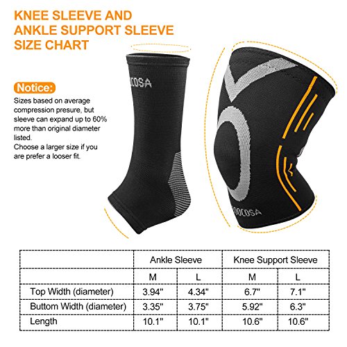 - CHOOSE BEST SIZE - M/L size available. PLEASE COMPARED WITH OUR SIZING CHART and choose your size. Package include 1 pair knee supports and 1 pair ankle sleeves. BOOCOSA provides ONE year warranty and a THREE month money back guarantee, coupled with professional customer service support.