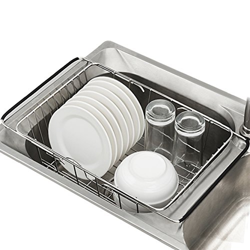 -. Feature : The drainer basket is 13.4" L, 9.8" W, 4.3" H. With the adjustable arms fully extended it is 16.7" long, can balances over sinks between 13.4" and 16.7" long, 9.8" wide. Make sure you take measurements before your purchase / High quality dish drainer rack. Clean and simple look, excellent workmanship. Made of high quality stainless steel, moisture-proof and anticorrosion, long time resistance to salt, water and other acidic substances corrosion, rustproof, durable, non-slip and easy to clean / Non slip extendable rubber arms won't scratch sinks or countertops and keep the rack not fall down into the sink, make it fit different types of sinks / The sink dish rack is multifunctional to dry dishes, clean fruit and vegetables, cooling rack for baked goods or a trivet for hot pans / The drainer rack is a great space saver. It's ideal for small kitchens, mobile homes, office kitchenettes, or anywhere drying space is limited