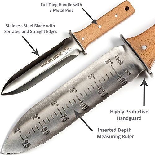 - USEFUL AND HANDY. Because of its double edged blade, serrated as a saw on one side and extra sharp on the other, and the embedded graded ruler, the hori hori gardening knife is a perfect replacement for different gardening tools like trowels, weed pullers, digging tools, bulb planters, measuring utensils and many others.