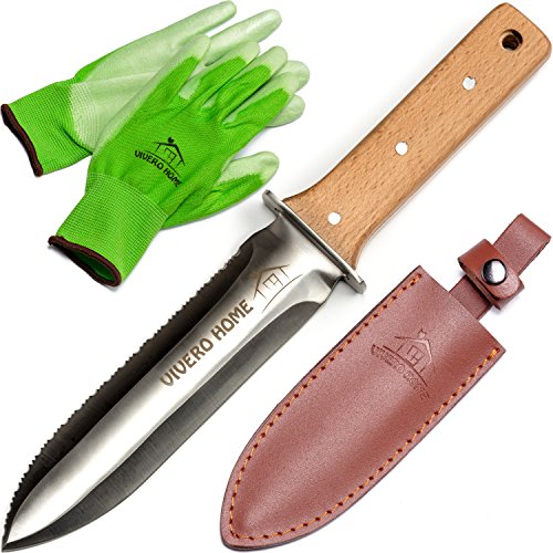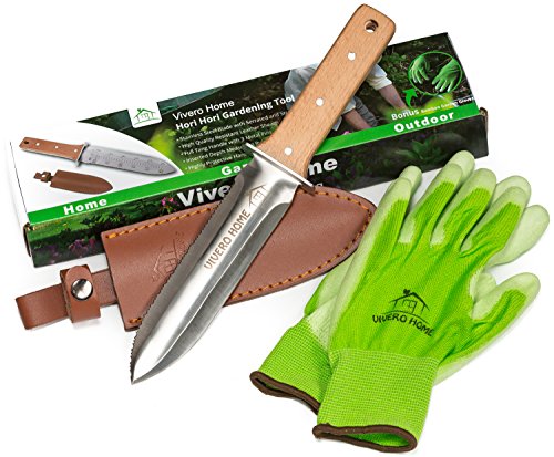 Vivero Home Multi-Purpose Japanese Hori Hori Garden Knife + Garden Gloves + Leather Sheath. Stainless Steel Blade with Handguard. Garden Tool for Gardening, Landscaping, Digging, Weeding, Camping