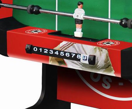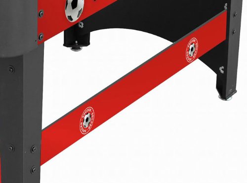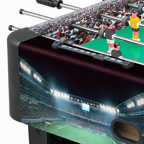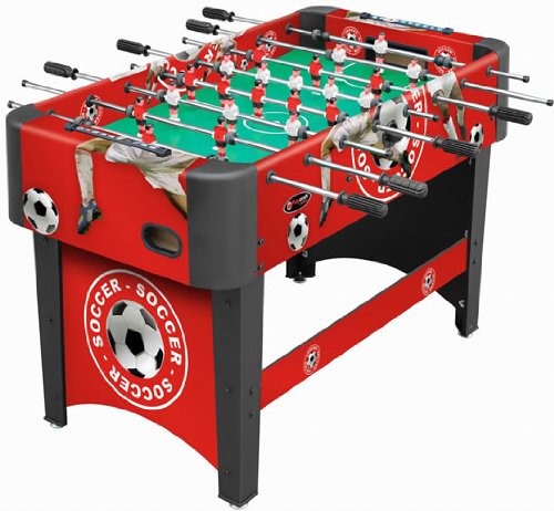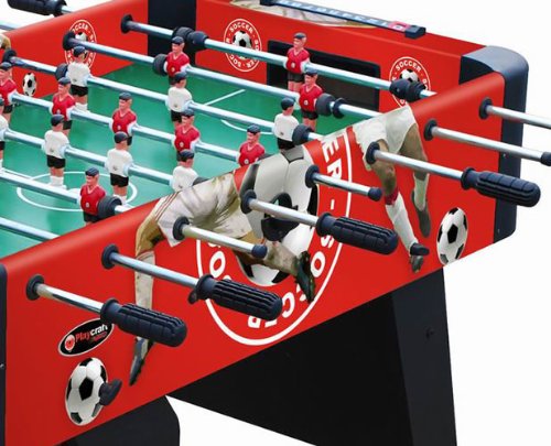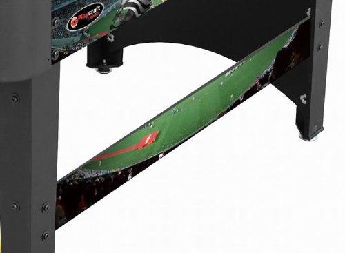 ReleaseDate : 2013-03-18 Studio : Playcraft Sport Publisher : Playcraft Sport Binding : Sports Product Description Exciting soccer field and crowd graphics Unified leg panel design with leg spanners on each side MDF construction Strong Chromium steel rods with slide bearings for smooth rotation Ball serve cups on both sides for convenience Internal ball retrieval at each goal Plastic manual slide scorers at each goal ABS plastic corners Chrome plated leg levelers Includes 3 foosballs Also available in a model with folding legs. 0