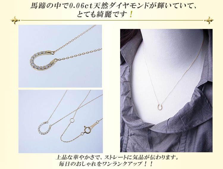 商品説明 イエローゴールドの馬蹄の中で0.06ct天然ダイヤモンドが輝くかわいいネックレスです。