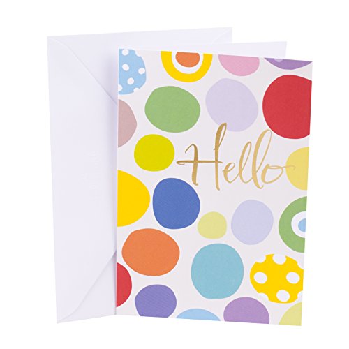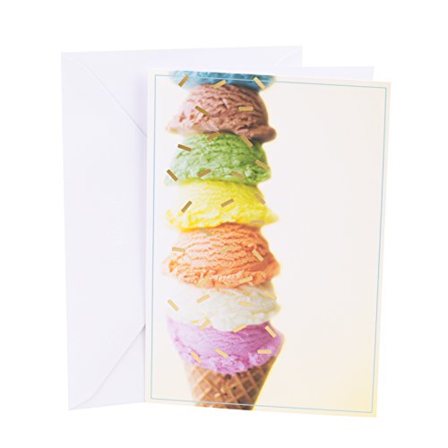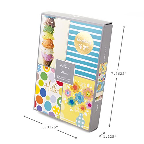 Perfect for any occasion, these cards feature four different designs: an ice cream cone with colorful scoops, aqua blue and white stripes with "Thinking of you" lettering, brightly colored dots with "Hello" lettering, and a whimsical vase with flowers. The cards are blank on the inside and measure 5 by 7.25 inches with 12 cards and 12 envelopes with four different designs included. Hallmark greeting cards are made with paper from well-managed forests. Hallmark was founded in 1910 when 18-year-old J.C. Hall arrived in Kansas City, Missouri, with a couple of shoeboxes of postcards under his arm and the American dream in his heart. Hallmark products are sold online and in nearly 40,000 retail stores across the globe and people continue to recognize the iconic Hallmark brand as "the very best."Feature