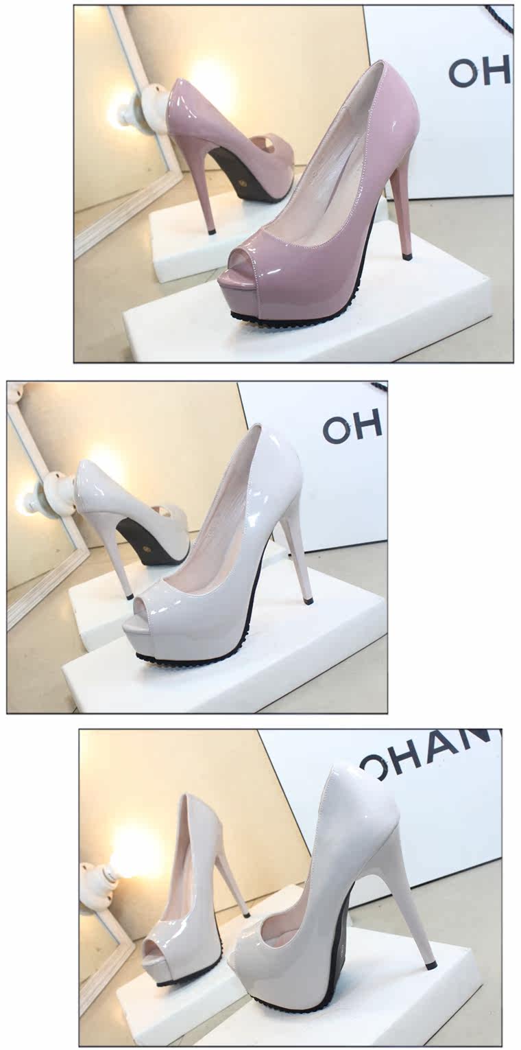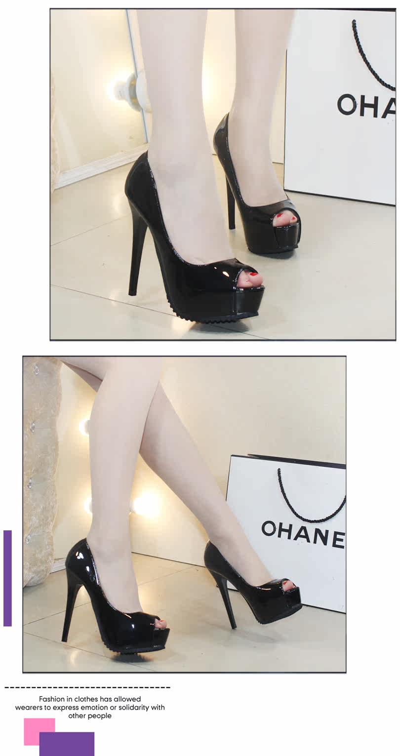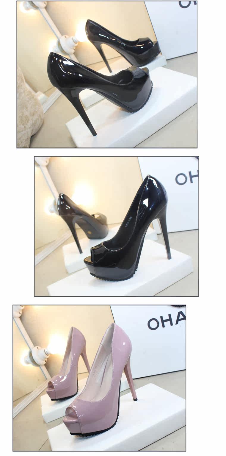 春夏高跟鞋女细跟鱼嘴单鞋黑色性感漆皮工作鞋防水台浅口