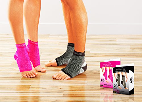 You can't just lay around all day! You have to go work, shop, work out, & get through your day. Get excited for the #1 Foot Doctor Physix Gear compression sleeves. They gently hold your foot at just the right angle to eliminate movement that is causing you so much pain. These Foot Sleeves give your heel & foot just the right amount of comforting compression recommended by Foot Doctors. Slip them on for fast relief & immediate comfort. Fashioned from 80% Nylon and 20% Spandex that gives you brilliant flexibility while still providing just the right combination of firm compression. Very durable, can be worn daily, easily washable. Whether you're using for home, running or sport, runners, cyclists & all athletes are able to gain the benefits of the best Plantar support available. Minimalist runners benefit from its thin design that fits perfectly with today's most popular minimalist shoes, while still providing superior support. These Plantar Fasciitis Foot Compression Sleeves come in stylish black and pink. Unisex to perfectly fit the needs of both men and women. The slim design insures they fit neatly under clothing. No one will realize you're wearing them. Get comfort & relief you need from nagging foot pain. No risk! Highest quality and backed by Amazon's standard guarantee. Order yours NOW and put an end to pain and limited mobility.