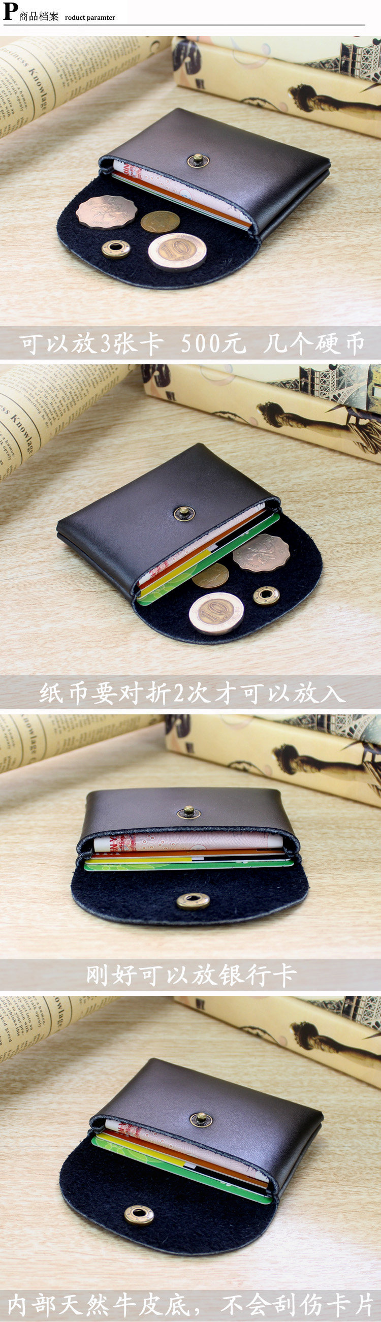 Capacity: 3 cards, 500 yuan (folded twice) a few coins