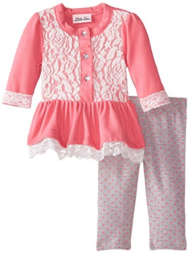 Little lass offers cute and comfortable styles with quality construction. She is adorable in this 2 piece legging set with a brushed knit peplum top with lace, crystal buttons, and printed knit legging.