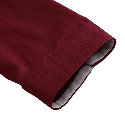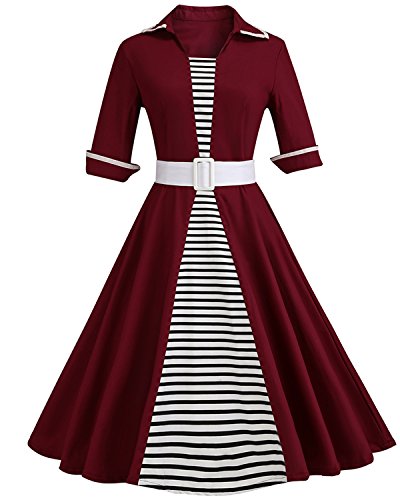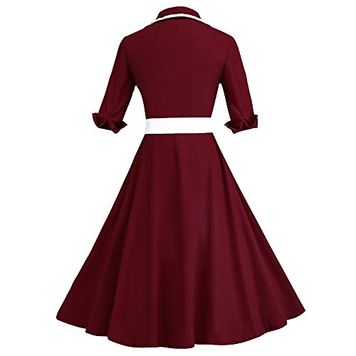 ZAFUL Women 1950s Vintage Dress 3/4 Sleeve V Neck Swing Party Dress with Bow Ribbon Belt(Wine red XL)