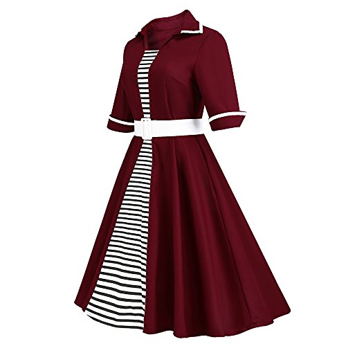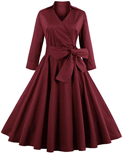ZAFUL Women 1950s Vintage Dress 3/4 Sleeve V Neck Swing Party Dress with Bow Ribbon Belt (XL, Wine)