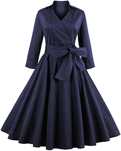 ZAFUL Women 1950s Vintage Dress 3/4 Sleeve V Neck Swing Party Dress with Bow Ribbon Belt(Navy XL)
