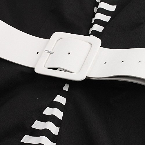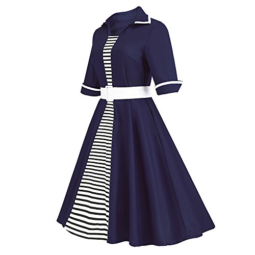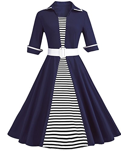 ZAFUL Women Vintage Lapel 3/4 Sleeve Dress Stripe Patchwork Pinup Party Swing Dress Plus Size with Belt (M, Black 2)