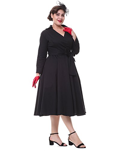 ZAFUL Women 1950s Vintage Dress 3/4 Sleeve V Neck Swing Party Dress with Bow Ribbon Belt(Black 3XL)