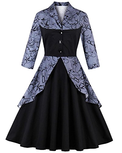 ZAFUL Women Vintage Lapel V Neck 3/4 Sleeve Dress Patchwork Button Cocktail Party Swing Dress Plus Size (M, Black 1)