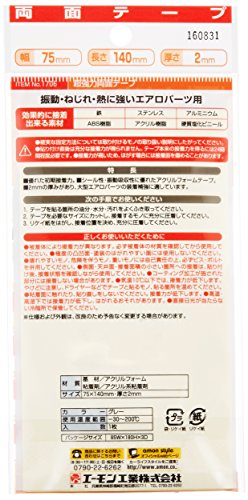 ◆ to the reinforcement and bonding of large exterior products such as aero parts. ◆ has excellent initial adhesive strength at low temperature at the time of the work environment (0 ℃). ◆ good wettability compared to the conventional VHB is at room temperature initial adhesion is excellent. ◆ is excellent in flexibility amenable to the unevenness of the adherend than conventional VHB. ◆ heat-resistant it has excellent weather resistance. ◆ sealing properties it has excellent vibration absorption. / ■ Specification ■ Size: Width 75mm × length 140mm thickness 2mm color: gray Operating temperature range: -30 ~ 200 ℃ Material: base material: acrylic foam adhesive: acrylic pressure-sensitive adhesive contents: super strong double-sided tape 1 sheet /
