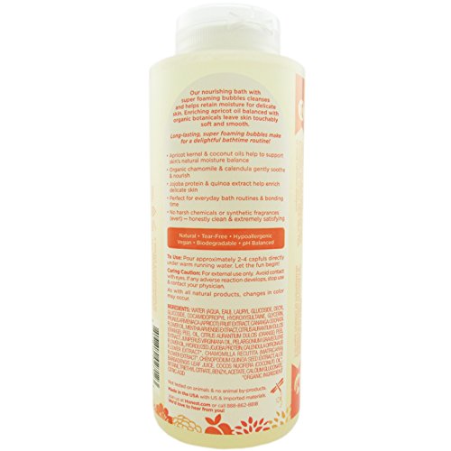 Our nourishing bubble bath with super foaming bubbles cleanses and helps retain moisture for delicate skin. Enriching apricot oil balanced with organic botanicals leaves skin feeling touchably soft and smooth.