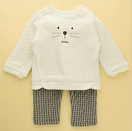 -멋스러운 연사조직의 기모티셔츠와 신축성과 보온성이 좋은 바지의 상하세트 상품입니다.-세련된 화이트컬러에 체크원단을 배색하여 감도있는 코디를 연출할 수 있습니다.-귀여운 곰자수인형이 포인트로 들어가 있습니다.