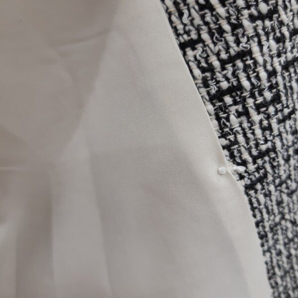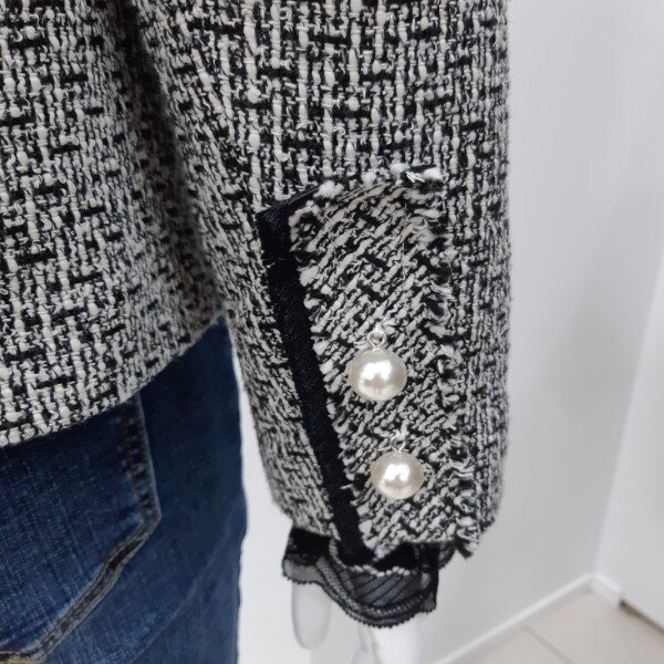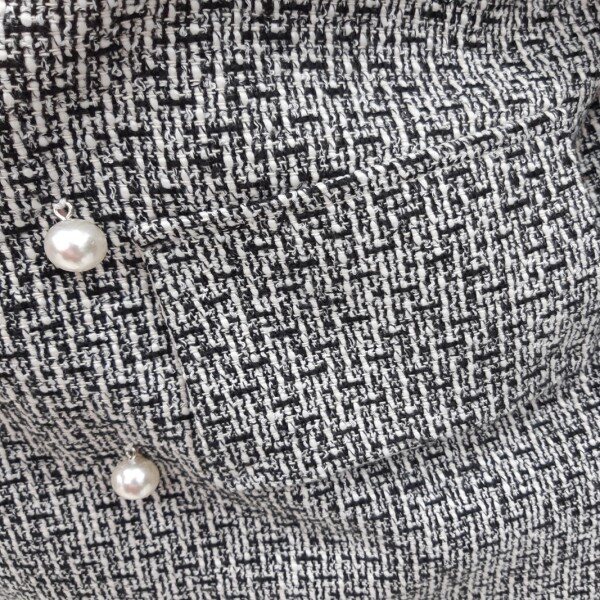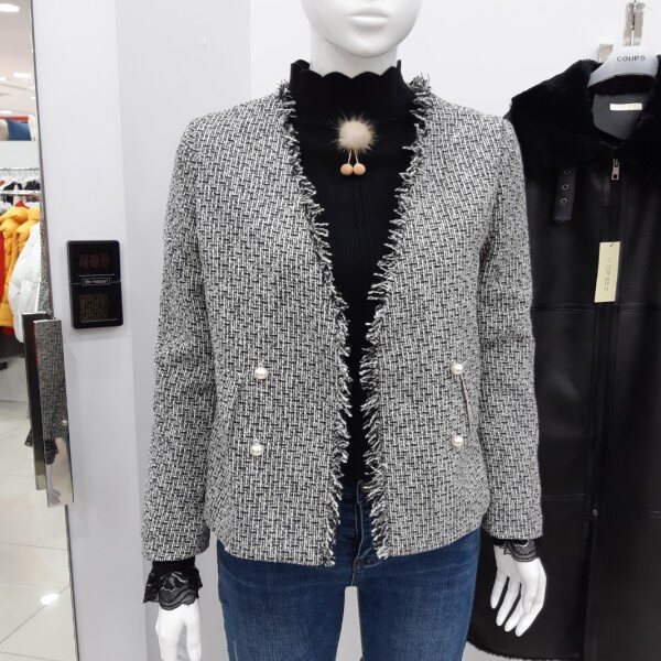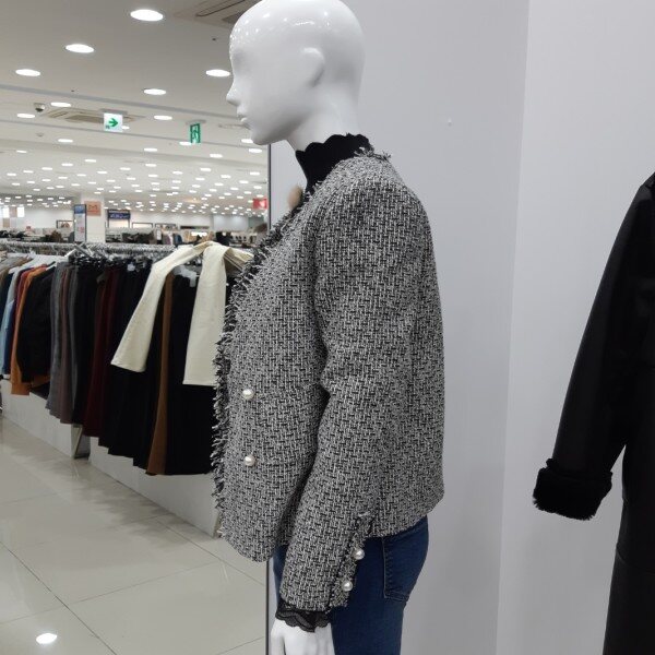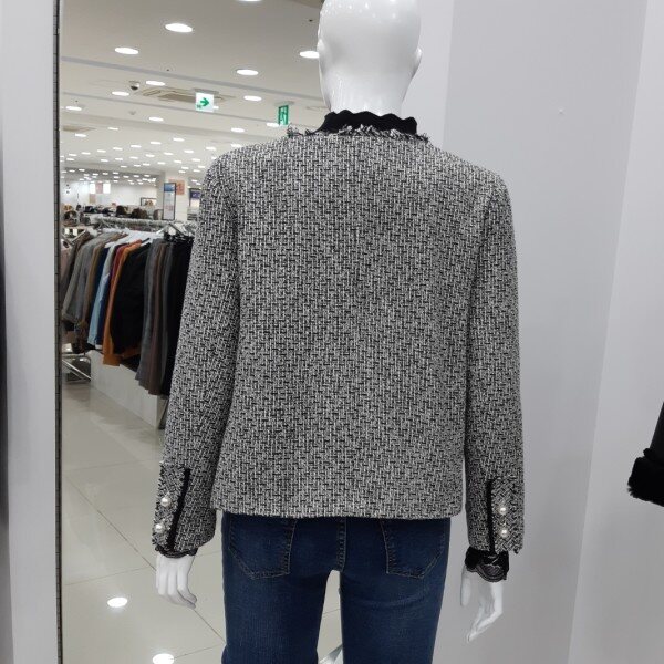 체크 패텐으로 고급스러운 자켓하단에 훼이크 포켓 장식으로 진주단추 포인트 더해주어 여성스러운 느낌