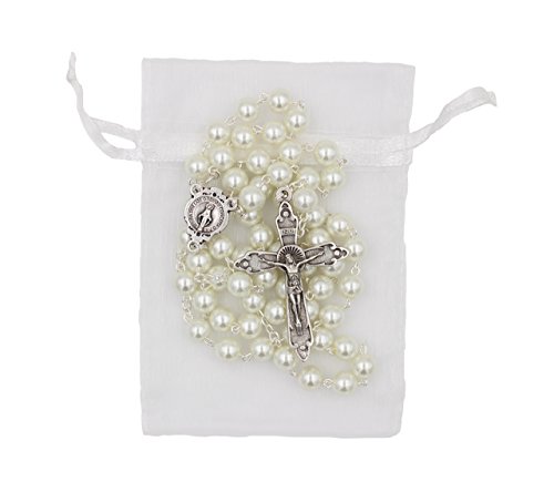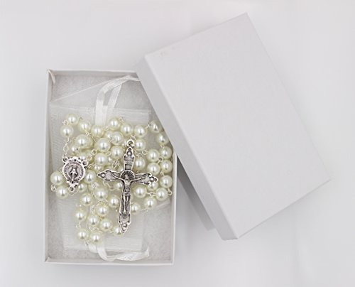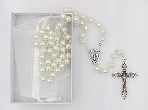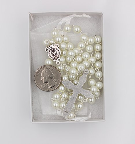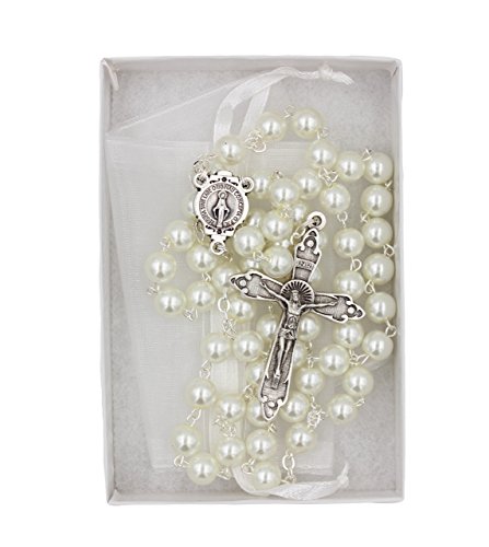 7mm Glass Bead Imitation Pearl Rosary Miraculous Medal Center Halo Cross