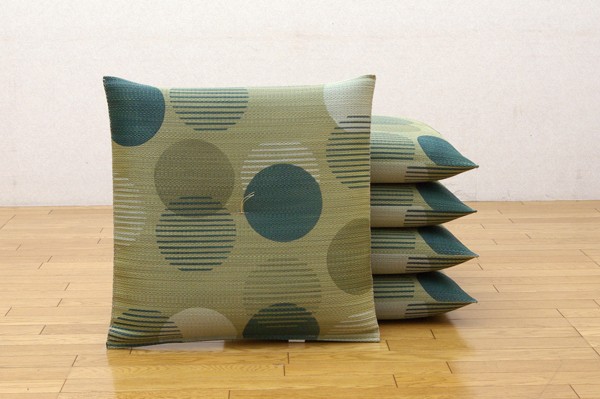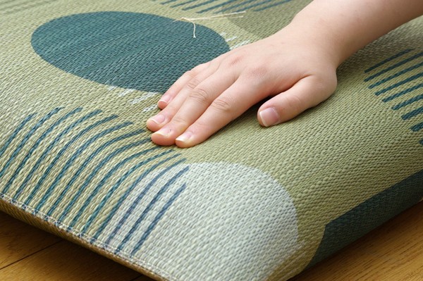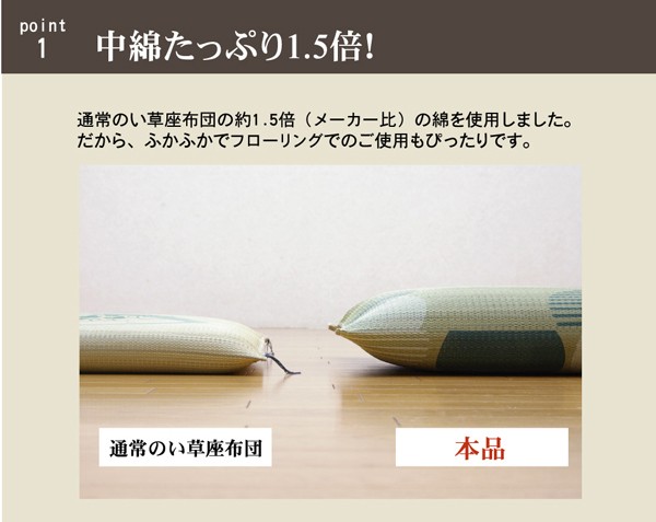 職人が1枚1枚手作業で捺染プリントを施したイ草座布団です。中材にはメーカー比1.5倍の量のわたを使用しています。ふっくらフカフカとしたボリューム感をお楽しみ下さい。生地にはメセキ織りと呼ばれる織りを採用し、柔らかくさらっとした肌触りに仕上げました。国産(九州産)のい草を使用しています。一本一本が太く、表皮が厚く繊維がキメ細かいので弾力性があり、耐久性に優れています。い草には空気の自然浄化作用、湿度の調節作用などがあります。また汚れにくく、使用するうちに黄金色に変化し味が出ます。い草に青森ヒバ加工を施しています(抗菌、防臭効果)。※柄のプリントは職人が手作業で描く為、同じ色・柄であっても多少風合いが異なります。