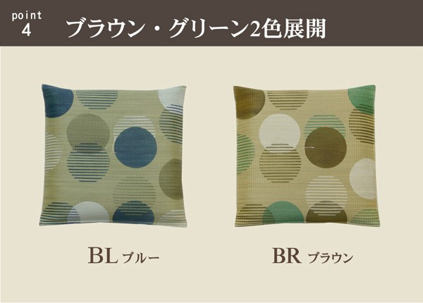 【商品名】 中わた1.5倍 純国産 捺染千鳥 い草座布団 『DXムース 2枚組』 ブラウン 55×55cm×2P 【ジャンル・特徴】 イ草 いぐさ イグサ 冷感 ひんやりマット ■サイズ・色違い・関連商品■2枚組 55×55cm ブルー■2枚組 55×55cm ブラウン[当ページ]■5枚組 55×55cm ブルー■5枚組 55×55cm ブラウン関連商品の検索結果一覧はこちら 職人が1枚1枚手作業で捺染プリントを施したイ草座布団です。中材にはメーカー比1.5倍の量のわたを使用しています。ふっくらフカフカとしたボリューム感をお楽しみ下さい。生地にはメセキ織りと呼ばれる織りを採用し、柔らかくさらっとした肌触りに仕上げました。国産(九州産)のい草を使用しています。一本一本が太く、表皮が厚く繊維がキメ細かいので弾力性があり、耐久性に優れています。い草には空気の自然浄化作用、湿度の調節作用などがあります。また汚れにくく、使用するうちに黄金色に変化し味が出ます。い草に青森ヒバ加工を施しています(抗菌、防臭効果)。※柄のプリントは職人が手作業で描く為、同じ色・柄であっても多少風合いが異なります。■