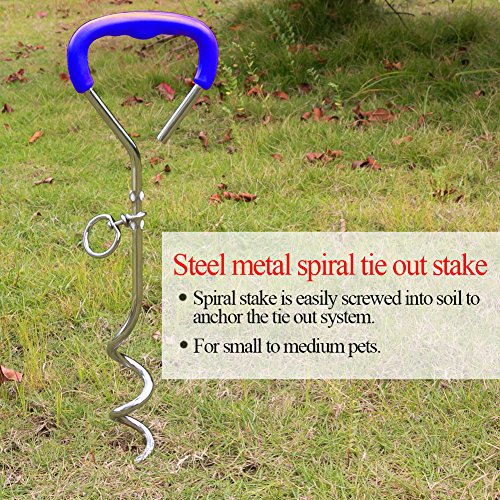 Easy to install Firstly, screw the 16in stake into the earth and make sure that it is firmly secure. Secondly, attach the clip at one end of the steel cable to the spiral stake. Thirdly, attach the clip at the other end of the cable to your dog's or cat's collar, Finally, make sure that your pet is safe when you are using this tie-out stake and cable.