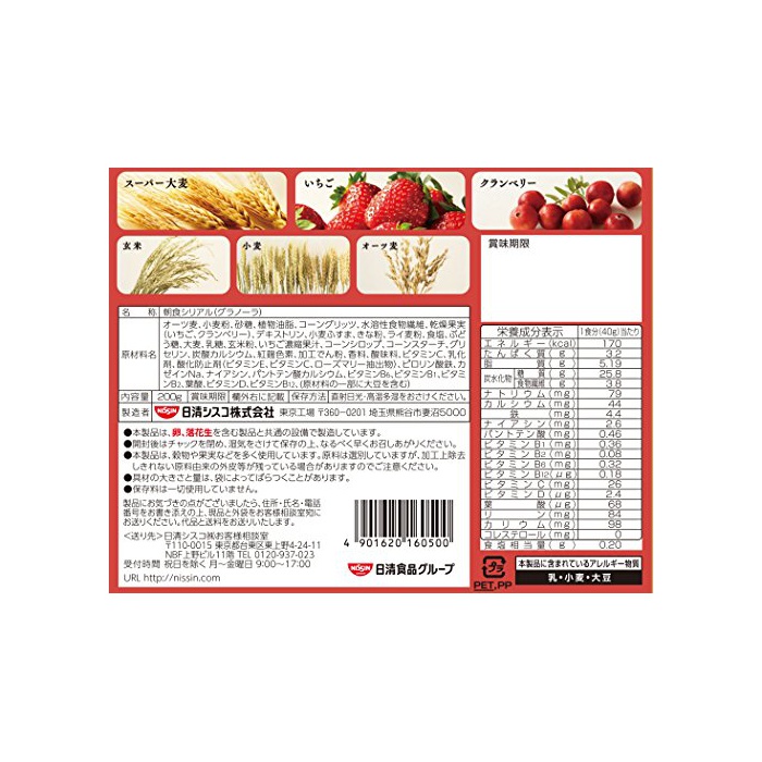 원재료:O《즈》맥,소맥분,설탕,식물성 기름지,콘《구릿츠》,수용성 식물 섬유,건조 과실(딸기,크랜베리)고, 덱스트린,밀 # 해결되고, 콩가루,호밀분,식염,포도당,보리,유당,현미분,딸기 농축 과즙,콘 시럽,콘 스타《지》,글리세린,탄산 칼슘,홍국색소,가공 나오지 않겠 분,향료,신맛료,비타민C,유화 제,산화 방지제(비타민E,비타민C,rosemary 추출물)고, 《피로린》산철,(Kasein)카세인Na,나이아신,판토텐산 칼슘,비타민B6,비타민B1,비타민B2,엽산,비타민D,비타민B12,(원재료의 일부에 대두 포함한다)