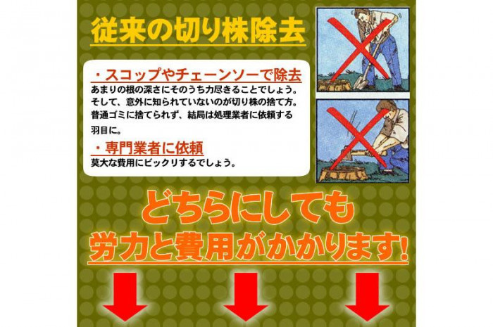 切り株の除去って思った以上に難題。チェーンソーで試みるも、根の深さに断念→専門業者に頼む→高額な請求が!そんな時はスタンプ・アウトをお試しください。水溶液を切り株に注入し数ヶ月放置、その後灯油で燃やせば根こそぎ除去!人体、植物に無害な成分なので安心。すてきなお庭を有効活用!