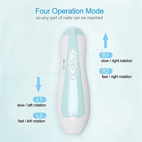 Feature: ? Easy to use - Baby nail trimmer kit using one button operation just move the central button up or down to select the working modes (including fast low speed, clockwise anticlockwise rotating). ? Quiet motor - You never worry about loud noises waking sleeping babies. ? Soft LED design - This LED can light your baby's nail when while trim the toddler toes or fingernails. ? Various Functions - The baby nail file comes with 9 different types grinding heads, 3 cushioned sandpapers for babies and children use, as well as 3 attachments for adult use. Extra 3 attachments Complimentary cushioned sandpapers.