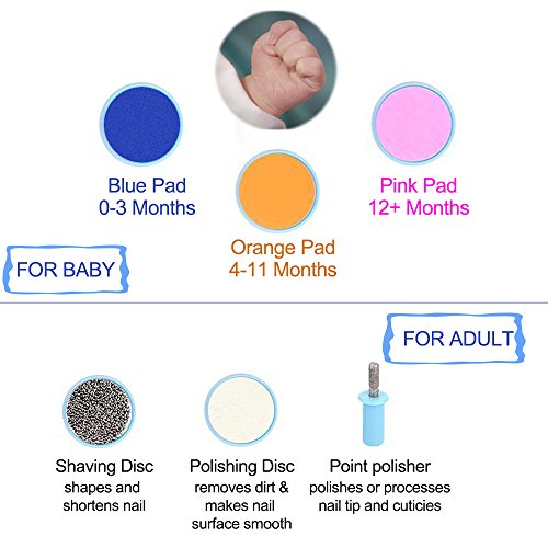 6 Grinding Heads: *For Baby Use Blue one: for 0~3 months old baby Orange one: for 4~11 months old baby Pink one: for over 12 months old baby or toddlers *For Adult Use White one: used for polishing the toenails or fingernails Stainless grinding head: for adults Cylinder grinding head: for adults to polish the edges of the nail