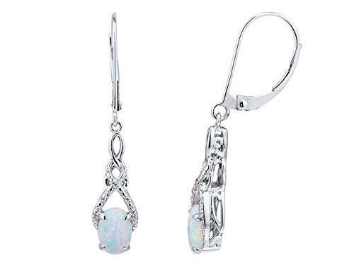 Lovely dangle earrings feature 2 7x5 MM oval shape Lab Created Luminous opals in a diamond accented twist setting. Each earring has beaded accents and 5 round diamond accents. HI Color, I2-I3 Clarity. Total diamond weight for the pair is .002 carats. The earrings are set in Rhodium Plated 10k White Gold with Lever Backs. We recommend cleaning in mild soapy water and buffing gently with a soft cloth.Feature