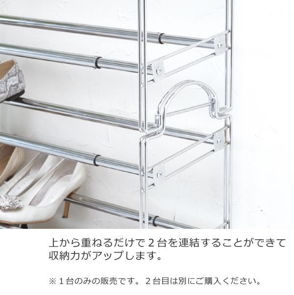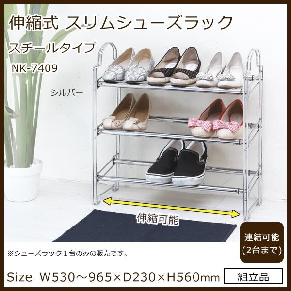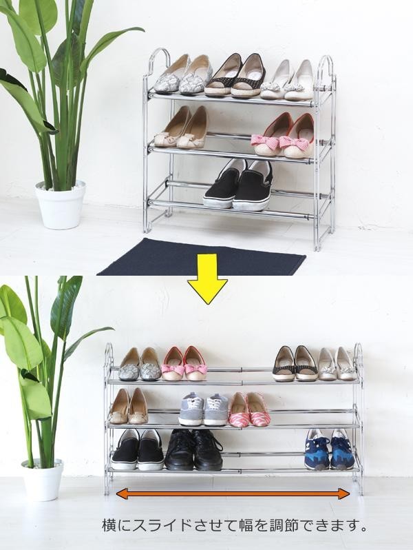 スペースに合わせて伸縮可能なシューズラックです。小さな玄関や下足箱の上にピッタリ。玄関をスッキリ見せ、狭い空間を有効活用できます。スペースや収納量に合わせて、横にスライドさせて幅を調節することができます。また、2台まで上に積み重ねることができるので、さらに収納力がアップします(1台のみの販売です)。汚れてもお手入れしやすいスチール仕様です。 |