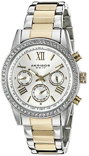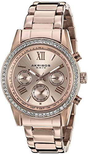 A true testament of modern style, this beautiful AKRIBOS XXIV Women's timepiece features a 36mm rose gold tone case with a Swarovski crystal studded bezel. This brilliant ring of sparkling stones frames a matte finish dial that is home to hand-applied Roman numeral and stick markers. Inside this elegant beauty is a prestigious ISA Swiss quartz movement that includes day of the week, date, and 24-hour functions. It is finished with a rose gold tone steel link bracelet with a polished finish!Feature