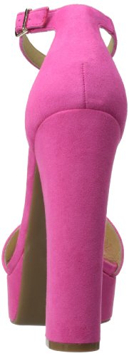 -. Feature : Faux-suede sandal with wide toe strap featuring towering heel and platform / Slender ankle strap with buckle