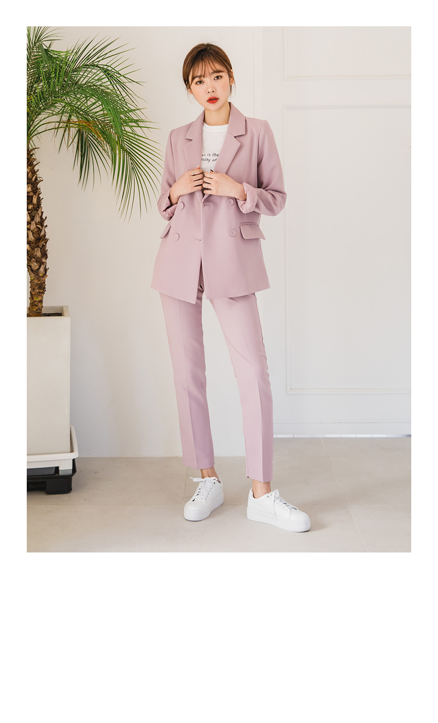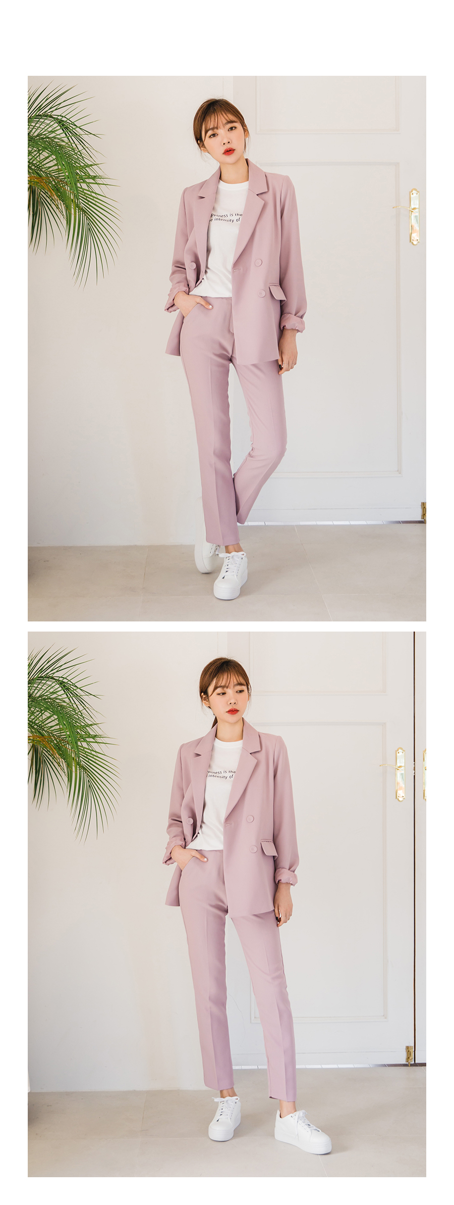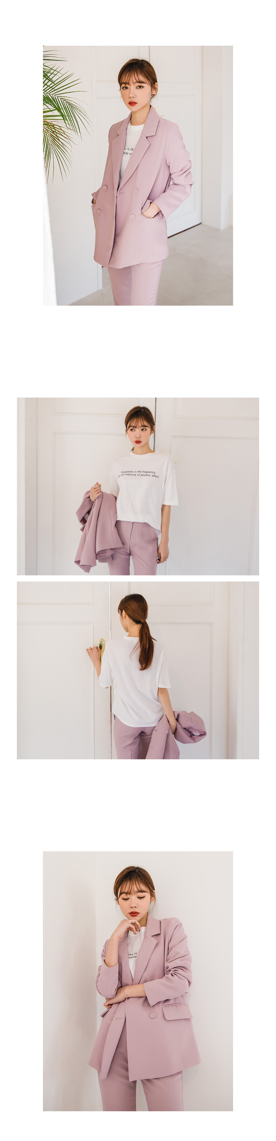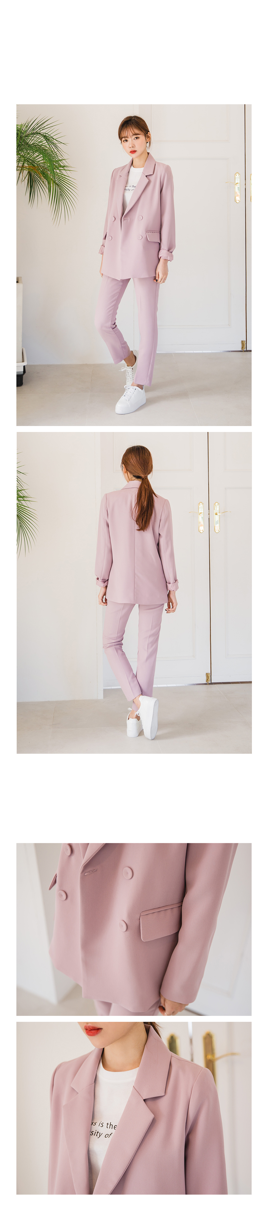 깔끔하게 떨어지는 기본 라펠이 돋보이는