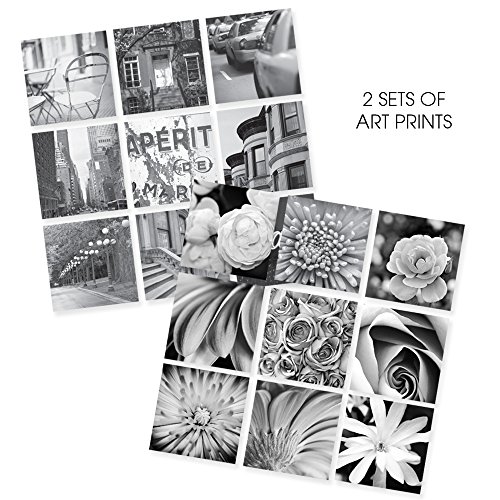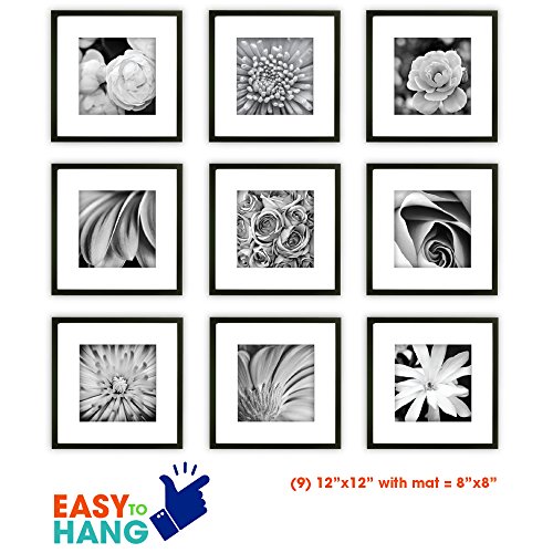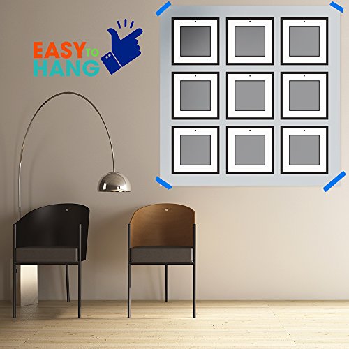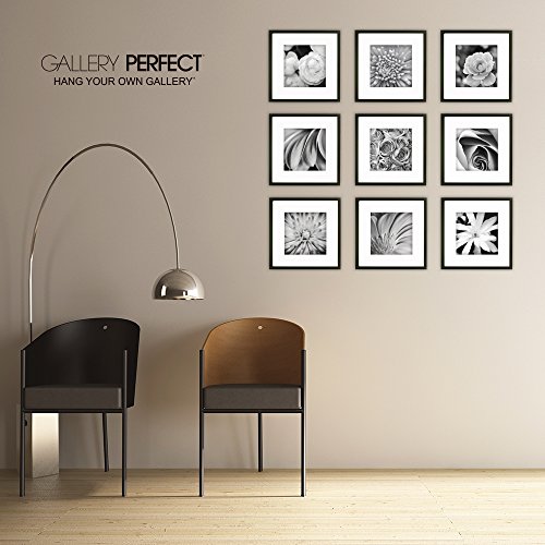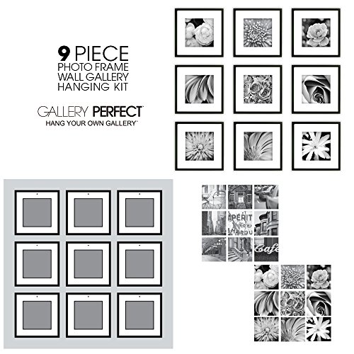 The 9-Piece Photo Frame Wall Gallery Kit comes with: (9) Black Wood Square Photo Frames with Removable Classic White Mats, (1) Easy-to-Hang wall template with multiple layouts, and (2) Sets of Art Prints you may use as optional instant decor. We’ve taken the hassle out of hanging frames with our Easy-to-Hang wall template system. Convenient and balanced style options are included with your wall gallery kit. Each frame is fitted with secure hanging hardware. Save money on decor with this simple design solution. Save time arranging your favorite memories with this easy to use 9-Piece Photo Frame Wall Gallery Kit. Gallery Perfect makes home decor a snap with our easily arranged wall gallery kit. Turn your Pinterest board into a gorgeous photo wall gallery. Take all the special moments captured on your smart phone and create a dynamic wall display. Be inspired! Gallery Perfect will help you arrange a beautiful wall gallery to show off your photos or favorite art prints with our easy to use template. The 9-Piece Photo Frame Wall Gallery Kit comes with (1) Easy-to-Hang wall template, offering multiple layout options. Add instant decor to any room with the (2) Sets of Art Prints, included with each frame.Feature