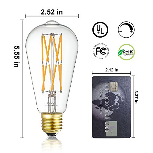 - ♦AFETY & ENERGY CONSERVATION: The LED Filament Light Bulbs conserve energy, The Brightness equal to 100W traditional Incandescent bulb. The temperature will never hurt your hand even after a couple of hours of use. High-grade electric source & chip Set minimize the light pollution like glare & stroboflash and protect your eyes from stimulation.