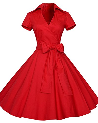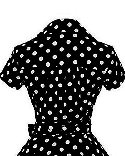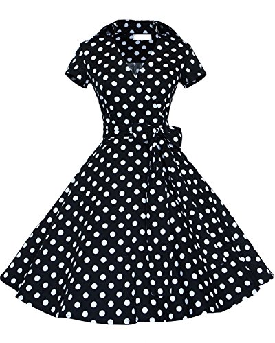 The vintage swing cocktail dress features polka dots, bow-knot decoration, lapel collar and pleated back and swing hem line style, v-neck design, side hidden zipper.