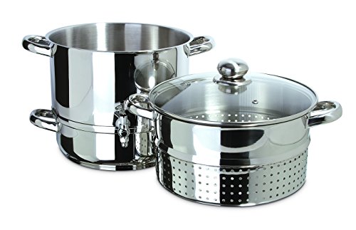 Includes a 3.5 Qt. Water Reservoir, 8 Qt. Juice Container with Spigot, 7.5 Qt. Steamer Basket and Glass Lid