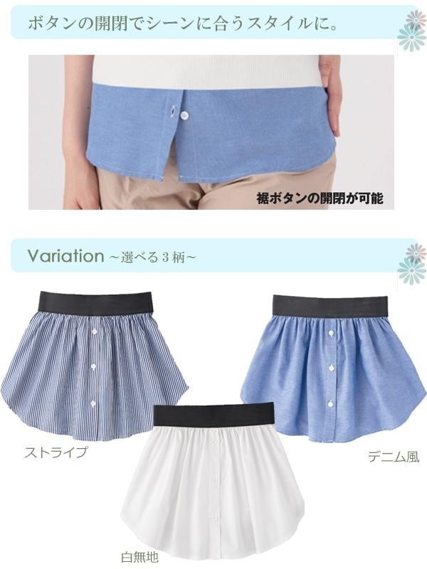 | 素材・材質 | 白無地・ストライプ:綿100%、デニム風:綿55%・ポリエステル45%、ウエストゴム部(共通):ポリエステル100% |