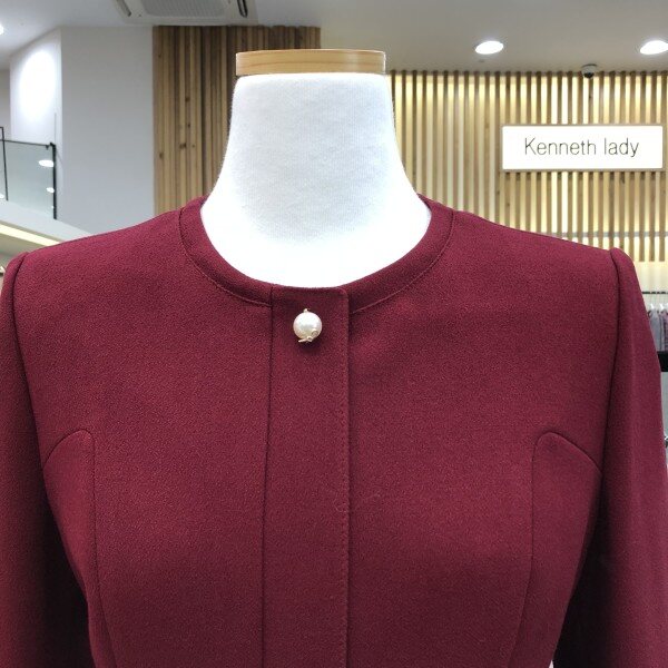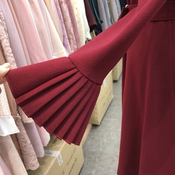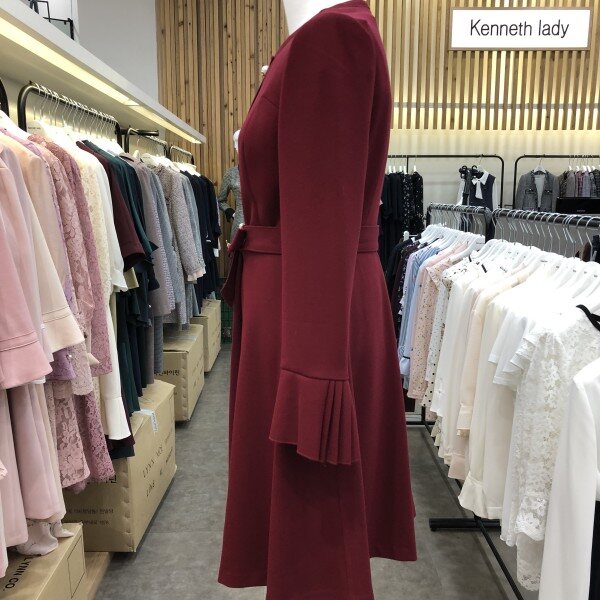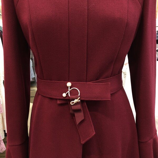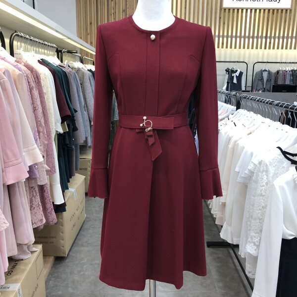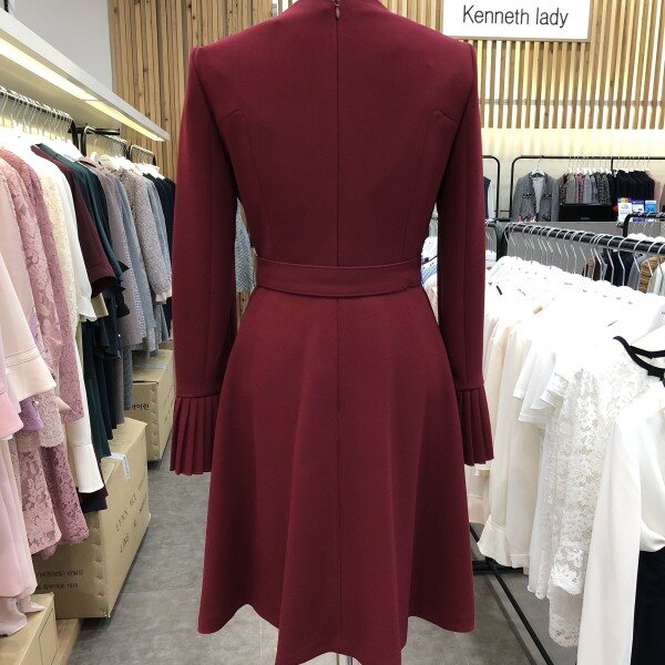 와인색의 벨트 포인트 원피스입니다~ 소매 주름라인이 이뿌게 포인트 되어 있어요